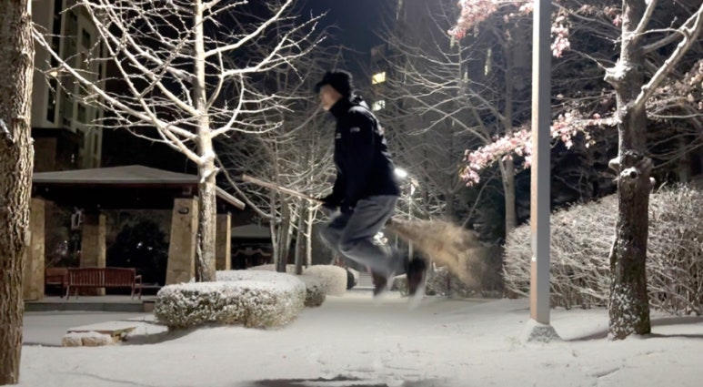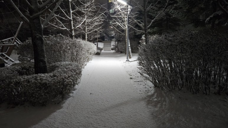 눈을 맞으며 걷고 싶어 딸아이와 서둘러 나섰지만, 아쉽게도 이미 눈발은 그쳤다. 그러나 단지 곳곳에 쌓인 하얀 눈은 여전히 새로운 계절이 시작되었음을 조용히 알려주고 있었다.