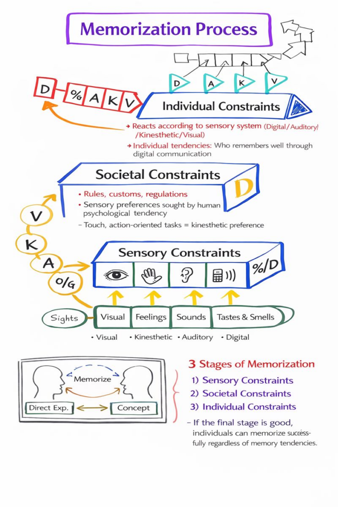 When we encounter an external event, we do not respond to it directly in NLP. Instead, the experience passes through several internal processes before it becomes our reaction. As external stimuli enter our system, they are first filtered through neurochemical limitations. Beyond these biological constraints, language, culture, and social frameworks apply additional layers of filtering. Finally, each individualโs preferred representation system transforms the information multiple times before it is stored in memoryโoften in a distorted form.
