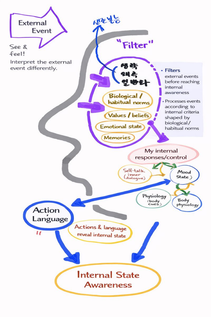 Our mental โfiltersโ create internal representations. These representations influence emotional states and physiological responses, which then appear externally as behavior and language. For this reason, effective coaching does not aim to change the event itself, but rather helps clients examine and reshape the filters and representations through which the event is interpreted.
