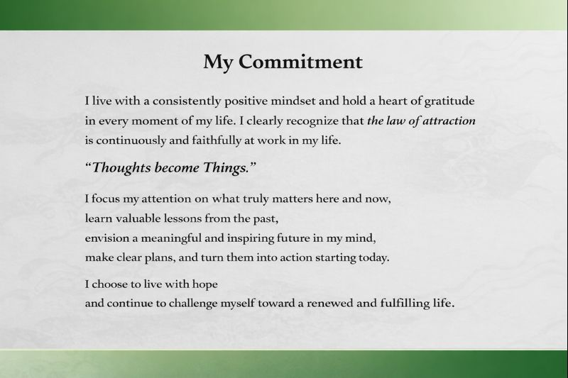 The first page is titled “My Commitment.” It is a declaration of how I choose to live each day and the direction I intend to take in life. Reading it aloud with good posture helps me internalize its meaning. A positive mindset, gratitude, attention to the present, learning from the past, envisioning the future, planning and taking action, and sustaining challenges. These are not grand slogans, but practical anchors that help me live with greater awareness each day.