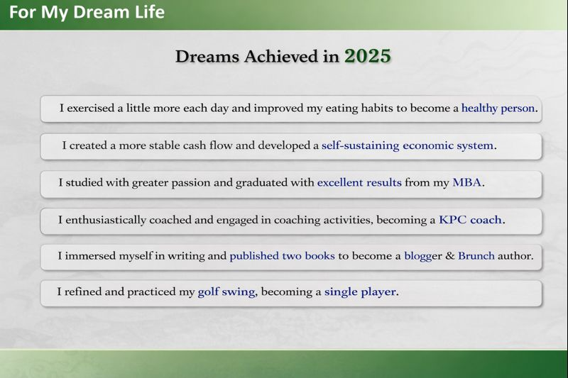 The second page is called “Dreams Achieved in 2025.” Based on NLP goal-setting principles, I rewrote my goals in completed form, as if they had already been achieved. This approach reduces unconscious resistance and allows the mind to visualize success more naturally. Speaking these statements aloud every morning, right after my commitment, has quietly become a habit.