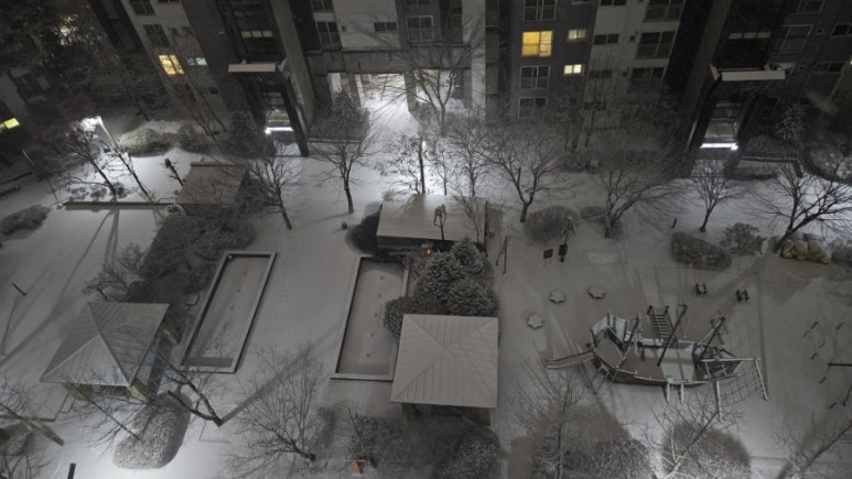 But during dinner, the dim light outside felt strangely different. I looked out the window—and there it was. Large, fluffy snowflakes were pouring down over the apartment complex. The first snow of the season.
