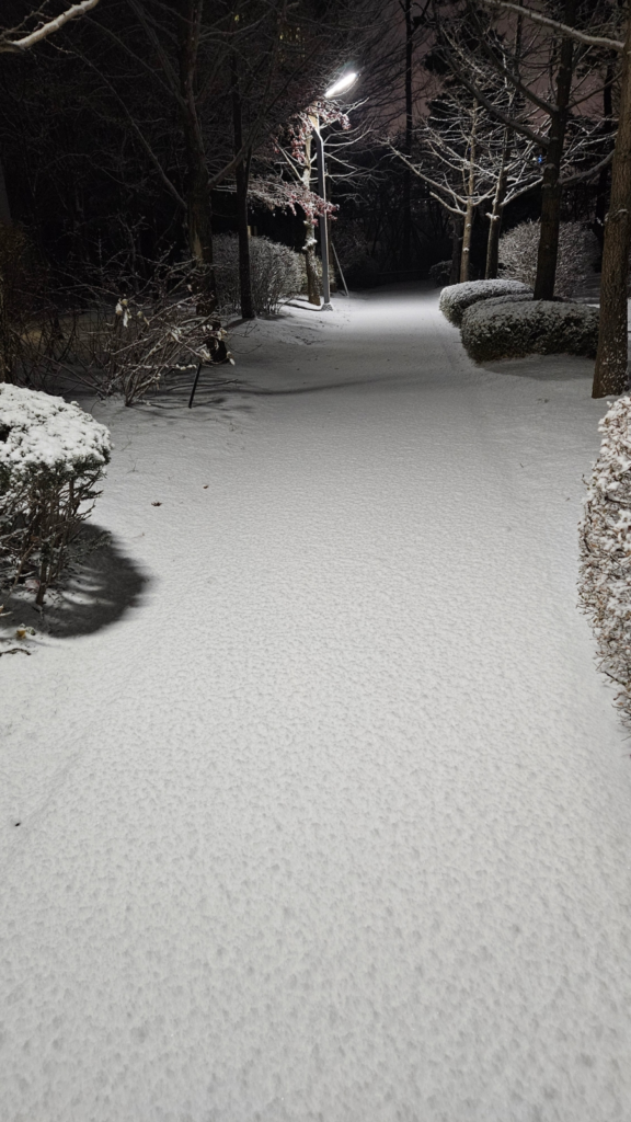 Paju, South Korea woke up to a staggering –13°C yesterday morning. The sudden drop in temperature transformed the city into a winter landscape almost instantly. Though my heart was still lingering in autumn, nature had already turned the page. The season’s first snowfall arrived without warning—and the emotion of that moment will stay with me for a long time.