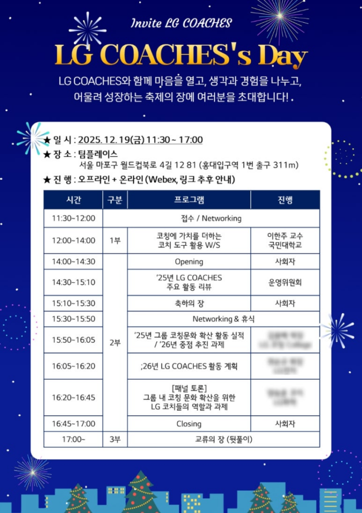 인생의 큰 전환기에는 늘 예상치 못한 조력자들이 나타나곤 한다. 내게 2025년은 그런 해였다. 블로그 글쓰기로 마음을 다스릴 때 곁을 지켜준 수많은 이웃들, 아주대 MBA 2년 과정에서 만난 원우들과 코치님들, 그리고 전 직장 코치 모임인 LG Coaches 멤버들까지. 수많은 도움의 손길 덕분에 혼란스러울 수 있었던 퇴사 후의 삶이 안정적으로 자리 잡을 수 있었다. 참으로 감사한 일이다.