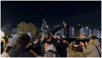 순간 몸이 가볍게 떠오르며 시야가 위로 이동했고, 사람들의 얼굴이 한눈에 들어왔다. 박수 소리가 터져 나왔고, ‘와’ 하는 함성이 거리 전체에 울려 퍼졌다. 여러 사람의 손이 내 몸을 떠받치고 있다는 촉감은 말로 표현하기 어려운 안정감과 따뜻함으로 다가왔다.