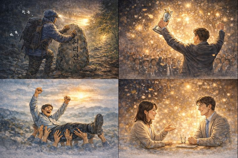 날이 밝아오며 희미한 빛이 숲 사이로 스며들었고, 나무와 바위, 이름 모를 꽃들이 마치 묵묵히 응원해 주는 존재처럼 보였다. 마침내 천왕봉 정상석이 시야에 들어왔을 때, 가슴 깊은 곳에서 뜨거운 환희가 솟구쳤다. 비에 젖어 까끌까끌해진 정상석을 두 손으로 끌어안았을 때 느껴진 차갑고 단단한 촉감은, “나는 끝까지 해낸 사람이다”라는 감각으로 몸에 새겨졌다.